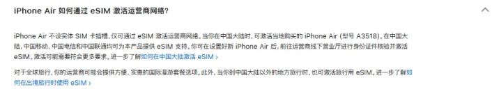 10月14日,苹果中国官网更新后的iPhoneAir发售信息显示,在中国大陆,中国移动、中国电信和中国联通均可为本产品提供eSIM支持。
